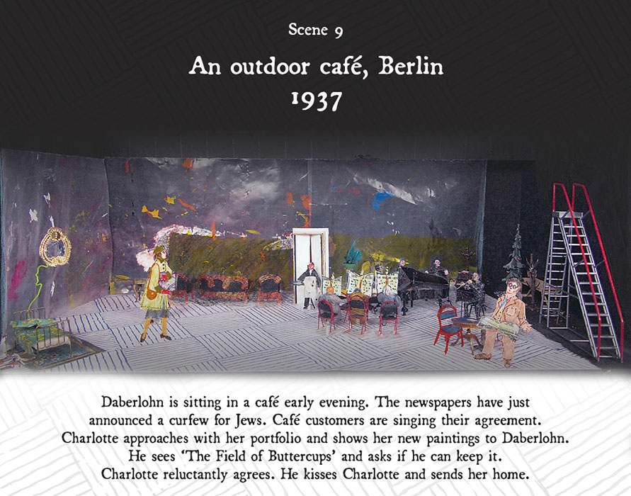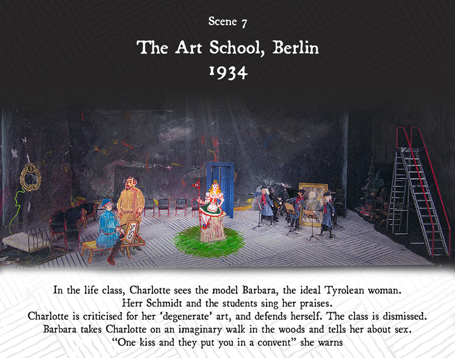 The interpretation of the three dimensional world of Charlotte Salomon is being manufactured by Domus/Idea in Vilnius, Lithuania, using a combination of laser technology in thin Baltic Ply and cardboard in a flat pack system, with hand painting by Pamela Howard.