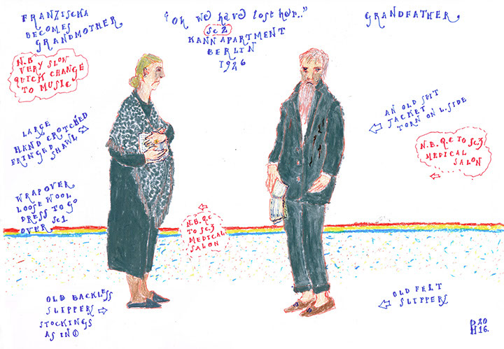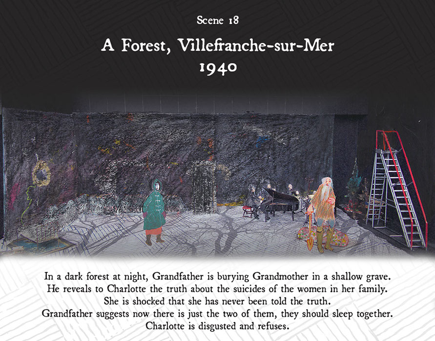 An exhibition of the drawings created for this production, with references to Charlotte’s visions of her remembered past.