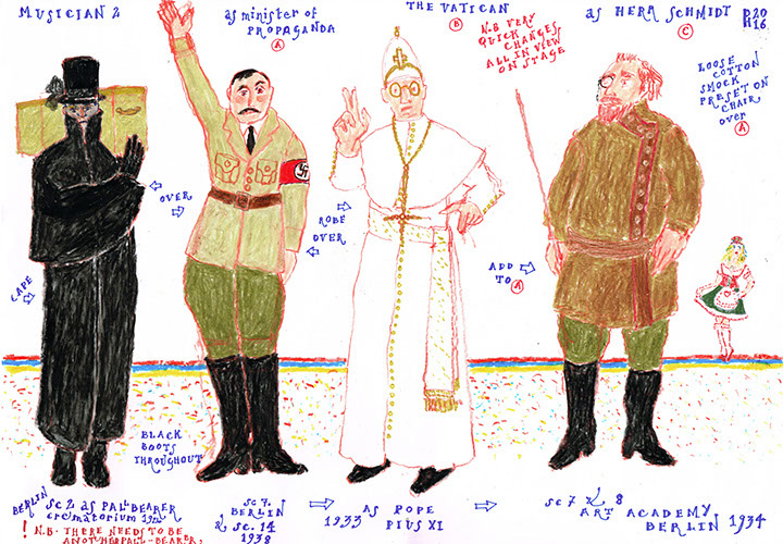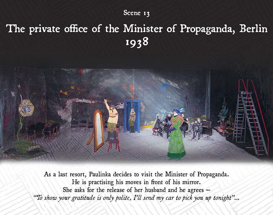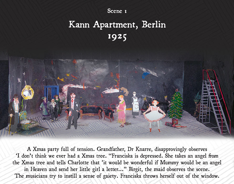 The interpretation of the three dimensional world of Charlotte Salomon is being manufactured by Domus/Idea in Vilnius, Lithuania, using a combination of laser technology in thin Baltic Ply and cardboard in a flat pack system, with hand painting by Pamela Howard.