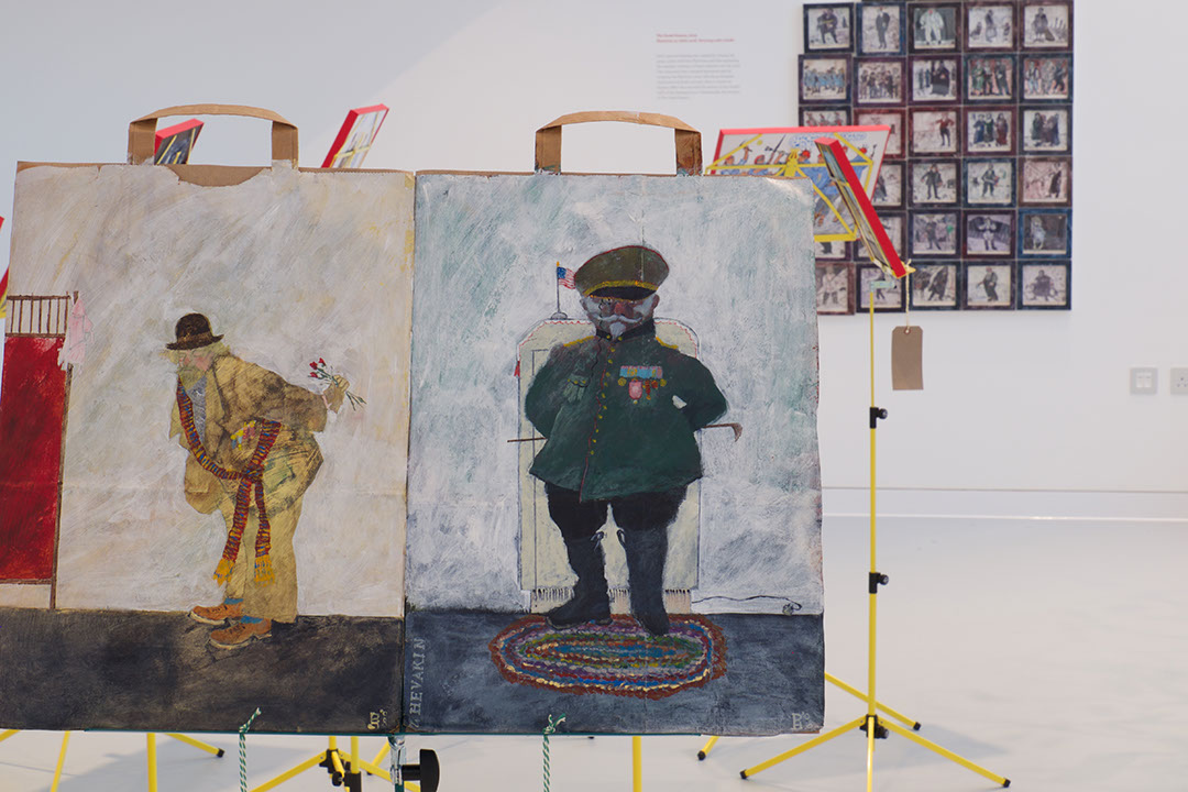 The drawings in the exhibit illustrate how Professor Howard transforms her ideas—from painting to sculpture; directing to psychology; business to advertisement; biography to storytelling. To accurately convey her thoughts, Professor Howard combines diverse media and techniques with found and repurposed materials which provide Professor Howard with the absolutely right feeling for a project. As she draws a character or scene, Professor Howard adds a layer of personal history and experience and brings the drawing to life.