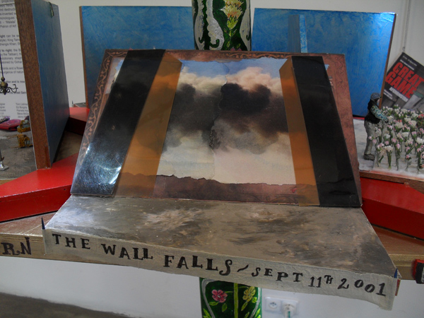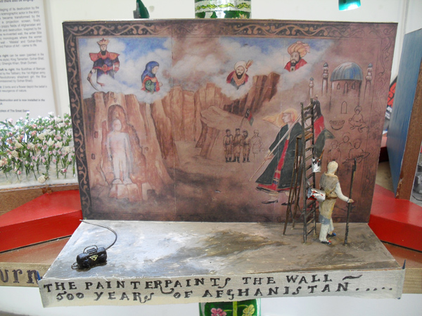 “The Story of the Wall” is an artefact taken from the Tricycle Theatre London’s highly successful production of The Great Game 2009/2010 and USA tour 2010/2011. It was conceived for the Society of British Theatre Designers exhibition in Cardiff in March 2011 to respond to the theme “Transformation and Revelation”. It shows how the principal scenographic element - a wall 5 metres high x 13 metres wide built on a simple hydraulic system transformed from an exterior wall to an Afghan Poppy field, following the content of the 12½ hour specially commissioned plays that made up The Great Game. The Carousel was inspired by a photo of an Afghan child in a destroyed landscape going to a fairground and playing with a miniature diorama. Each stage of the Wall is held between the points of a Red Soviet Star, which sits on top of a golden Pentagon. The viewer can turn the carousel. A central pole is painted in the Nuristani style and depicts the life cycle of the poppy, and the carousel stands on a base depicting an Afghan landscape as if seen from the air. It is entirely constructed out of found and discarded materials.