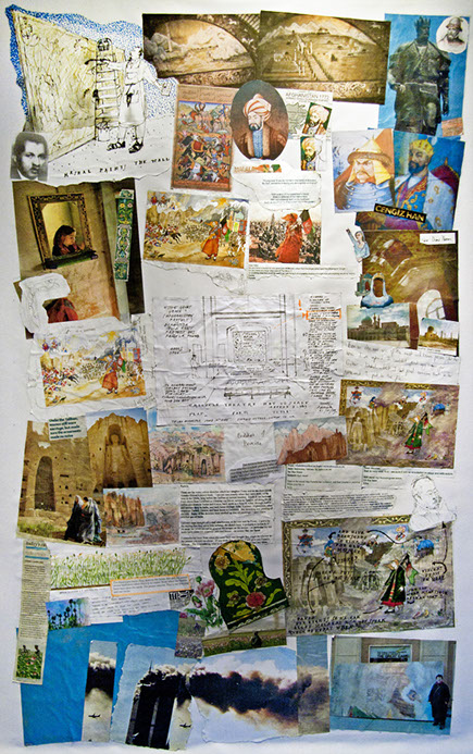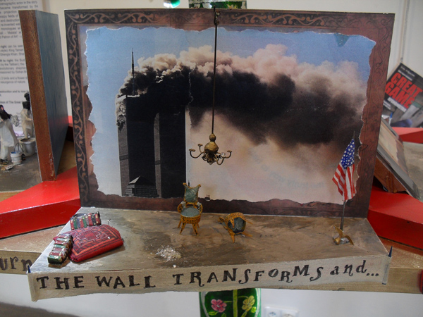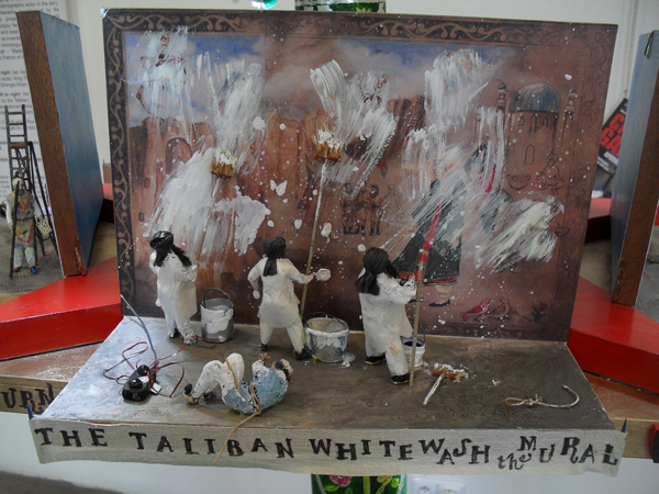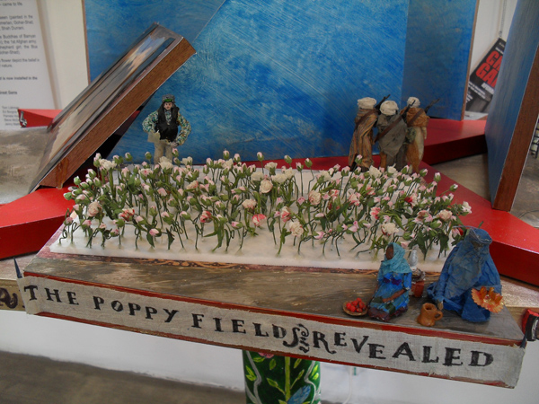 “The Story of the Wall” is an artefact taken from the Tricycle Theatre London’s highly successful production of The Great Game 2009/2010 and USA tour 2010/2011. It was conceived for the Society of British Theatre Designers exhibition in Cardiff in March 2011 to respond to the theme “Transformation and Revelation”. It shows how the principal scenographic element - a wall 5 metres high x 13 metres wide built on a simple hydraulic system transformed from an exterior wall to an Afghan Poppy field, following the content of the 12½ hour specially commissioned plays that made up The Great Game. The Carousel was inspired by a photo of an Afghan child in a destroyed landscape going to a fairground and playing with a miniature diorama. Each stage of the Wall is held between the points of a Red Soviet Star, which sits on top of a golden Pentagon. The viewer can turn the carousel. A central pole is painted in the Nuristani style and depicts the life cycle of the poppy, and the carousel stands on a base depicting an Afghan landscape as if seen from the air. It is entirely constructed out of found and discarded materials.